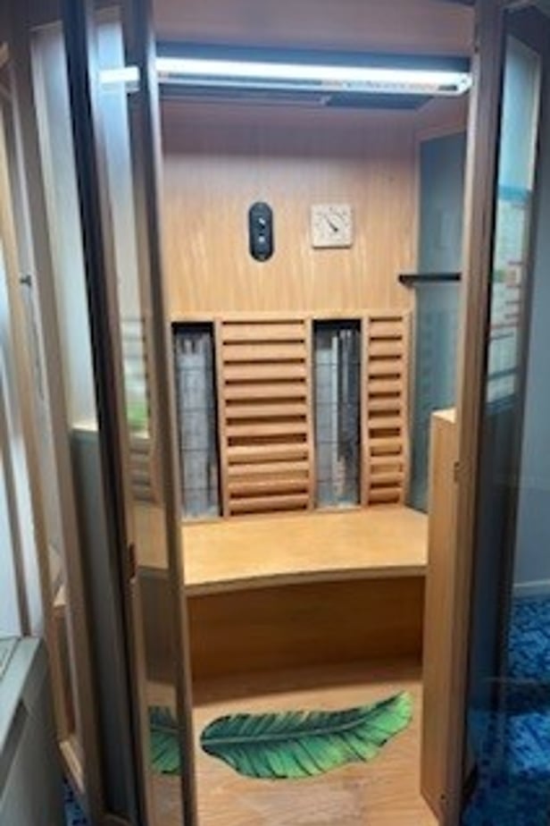 A far infrared sauna is a type of sauna that uses light to create heat that penetrates deeper in the body. Helps heal from within. Ours includes a sunlight bulb which can help people who get S.A.D through the darker winter months.